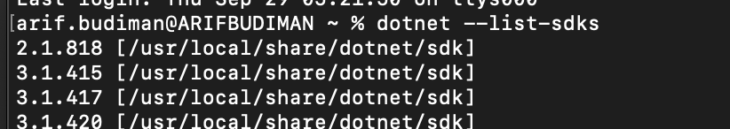 - Kemudian check versi dotnet dengan menggunakan command prompt dotnet --list-sdks