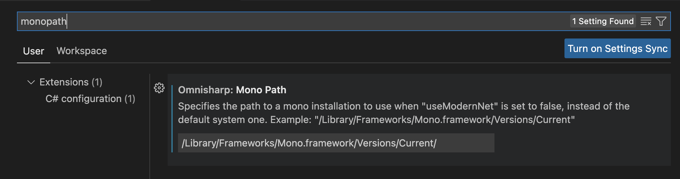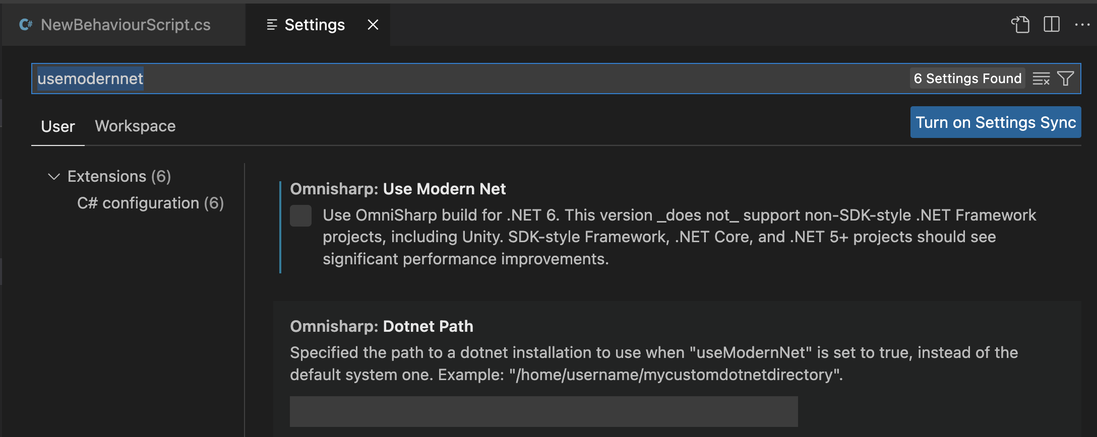 - Di VSCode kalian perlu settings dengan membuka Preferences > Settings, kemudian set OmniSharp.useModernNet = false seperti ini